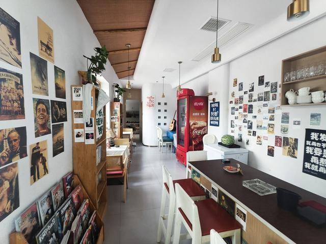 走进咖啡馆,仿佛踏入了一个充满复古韵味与文艺气息的小天地。中外电影片段画报错落有致地张贴在墙壁上,仿佛在诉说着电影里的动人故事;老式电视机静静地摆放在角落,散发着岁月的质感;琳琅满目的书籍整齐地排列在书架上,等待着人们翻阅。